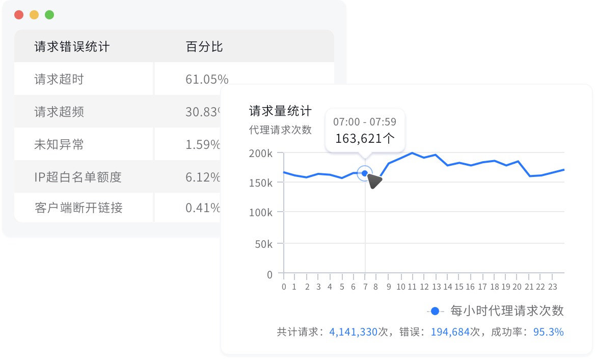 请求统计和错误统计分析,协助您优化采集策略、提升成功率 支持多维度图形和表单展示 - 请求统计和错误统计分析,协助您优化采集策略、提升成功率 - 支持多维度图形和表单展示